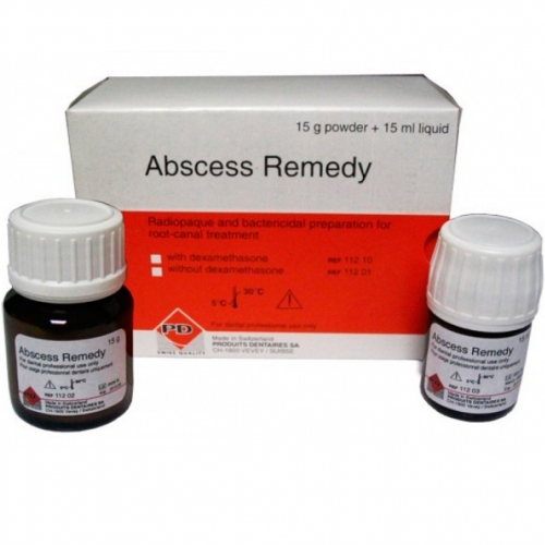 Abscess Remedy – рентгеноконтрастный препарат (порошок и жидкость), обладающий бактерицидным и антисептическим действием. Применяется для временного пломбирования и дезинфекции корневых каналов.