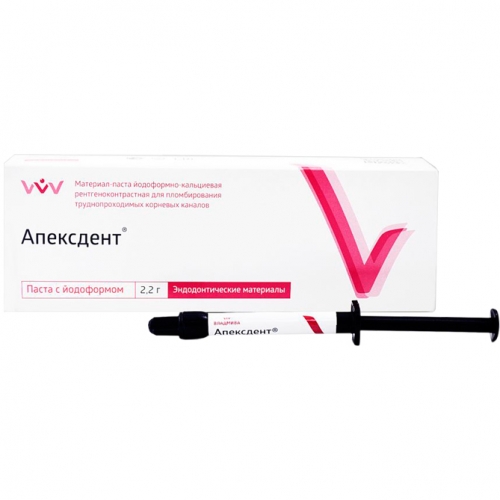 «Апексдент» с ИОДОФОРМОМ применяется для пломбирования корневых каналов после депульпирования и лечения инфицированных каналов зубов при хронических периодонтитах с рассасыванием гранулем; для апексификации при периодонтитах, при несформированном апексе, при перфорациях корня, а также резорбции кости.