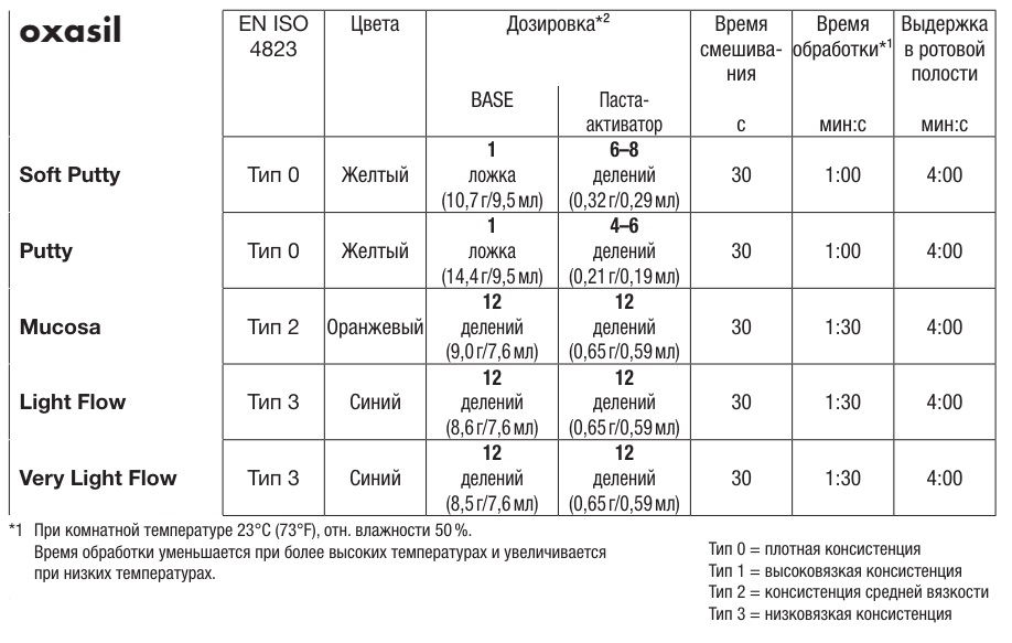 - Оттискные материалы oxasil: предназначены для снятия слепков с использованием всех стандартных методик в зависимости от профессионального опыта специалиста. К примеру, материалы могут использоваться при полном или частичном сохранении зубного ряда и при адентии для создания оттисков в целях изготовления полных, частичных протезов и капы, а также репарации, временного протезирования или регистрации окклюзии.